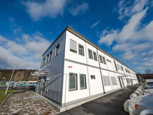 Östra sykehuset i Göteborg hadde behov for raskt å frigjøre arealer for pågående renovering og utvidelse, samtidig som den daglige driften måtte opprettholdes uten avbrudd. Løsningen ble et midlertidig modulbygg ved sykehusinngangen som samler apotek, mottak for enklere akuttbehandling (Nærhelse) og kontorer.