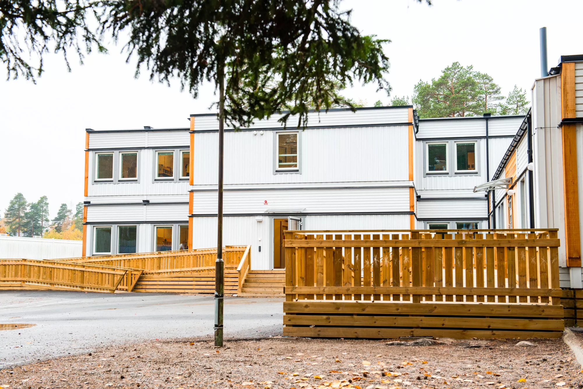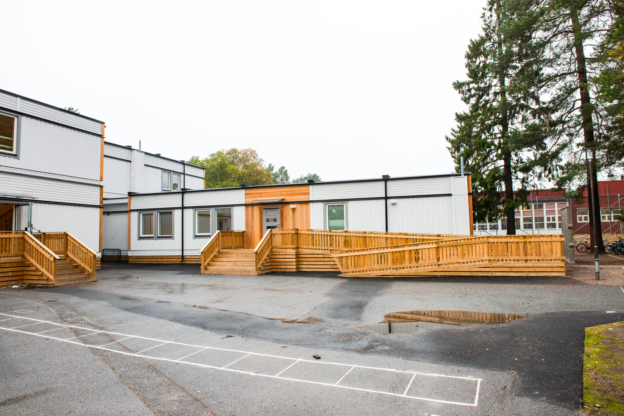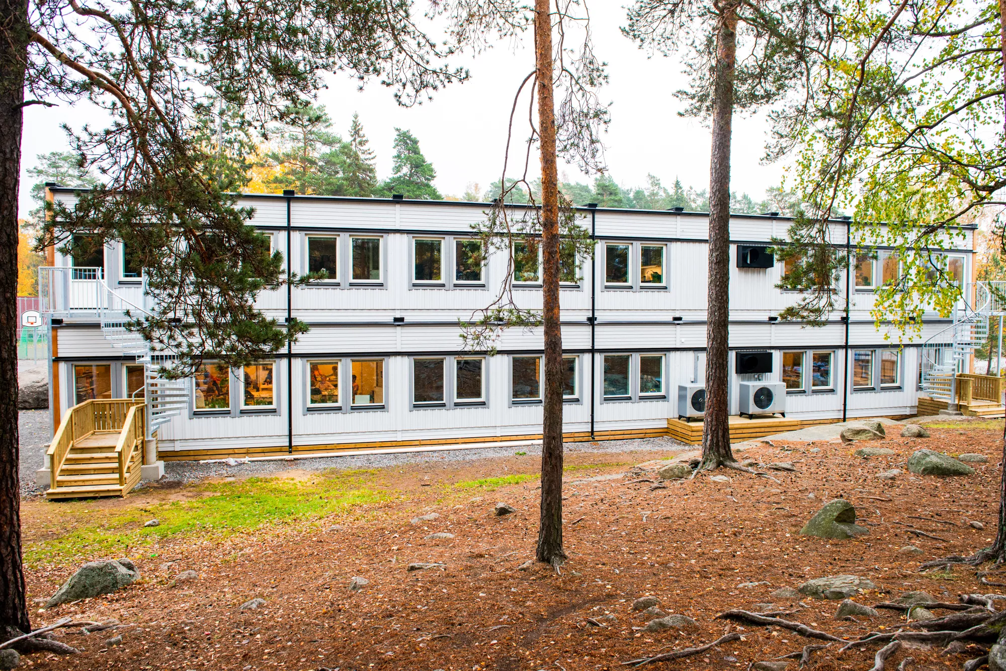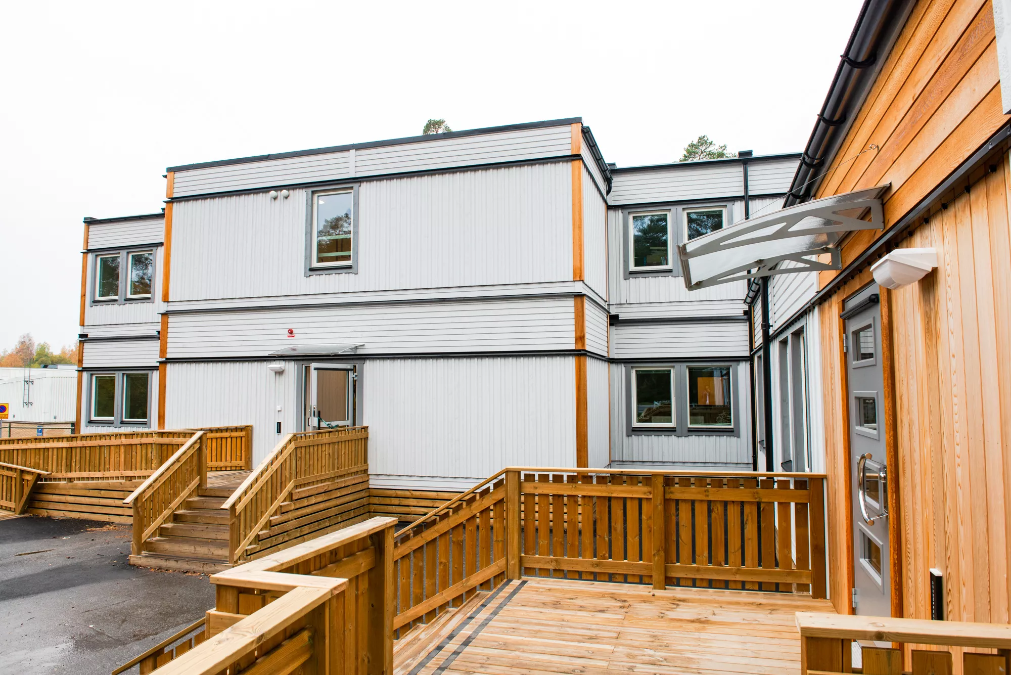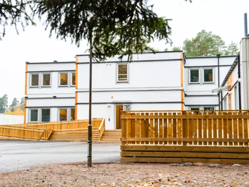- Skolebygget: 20 moduler i 2 plan med 4 klasserom, grupperom, personalrom samt trapperom med heis.